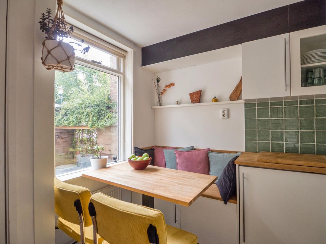 Indeling: entree, open keuken met inductiekookplaat, elektrische oven, afzuigkap, koelkast en massief houten aanrechtblad, bergkast, eethoek met vaste bank met bergruimte, souterrain met kasten voor wasmachine/droger, opstelling CV-ketel en werk/hobbyruimte, vanuit de entree toegang tot de woonkamer met glazen vouwwand naar de tuin, toilet met fonteintje, badkamer met wastafelmeubel en douchecabine, slaapkamer, overloop met bergruimte, slaapkamer met dakkapel en vaste kast.